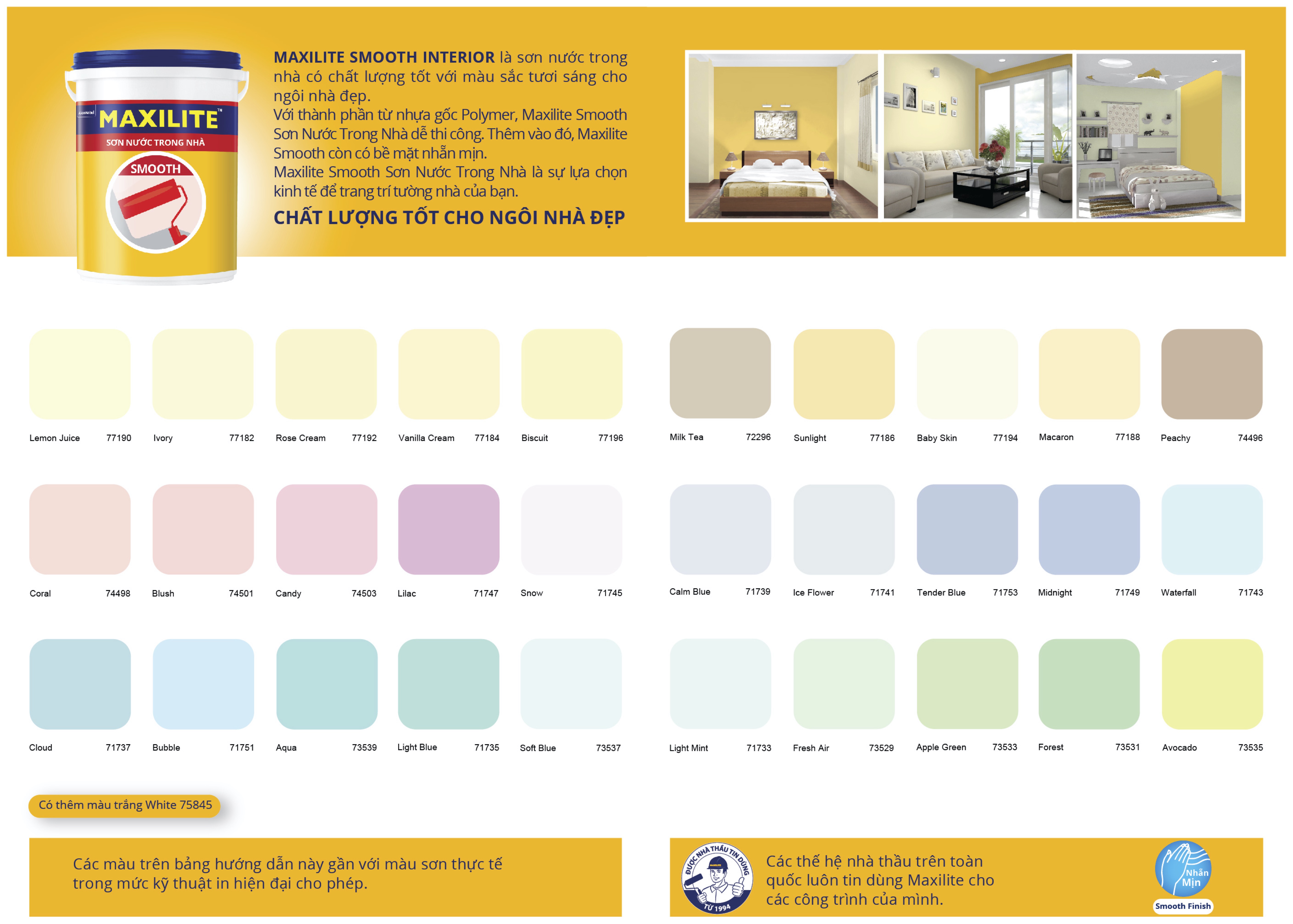 MAXILITE SMOOTH INTERIOR là sơn nước trong nhà có chất lượng tốt với màu sắc tươi sáng cho ngôi nhà đẹp.